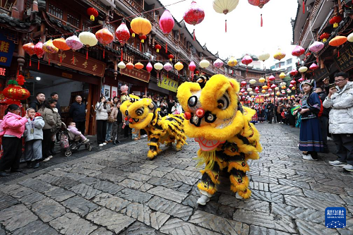 2月5日,人們?cè)谫F州省都勻市石板街觀看布依族婚俗表演。(新華社發(fā) 肖偉 攝)