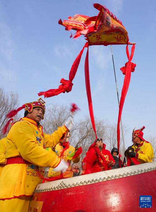 2月5日,在山東省鄒平市臺(tái)子鎮(zhèn),黃河大鼓表演隊(duì)在文藝廣場(chǎng)為村民表演。(新華社發(fā) 董乃德 攝)