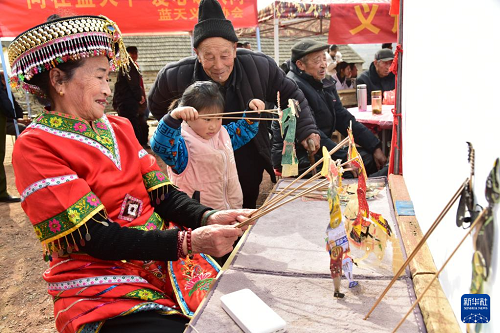 2月5日,山東省棗莊市山亭區(qū)水泉鎮(zhèn)柴山前村舉行“春晚”年會(huì),一名小姑娘跟隨民間藝人學(xué)習(xí)皮影戲。(新華社發(fā) 劉明祥 攝)