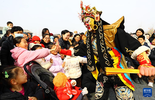 2月10日,在河南省周口市川匯區(qū)關(guān)帝廟廣場,進(jìn)行表演的民間藝人與觀眾互動。(新華社發(fā) 高建中 攝)