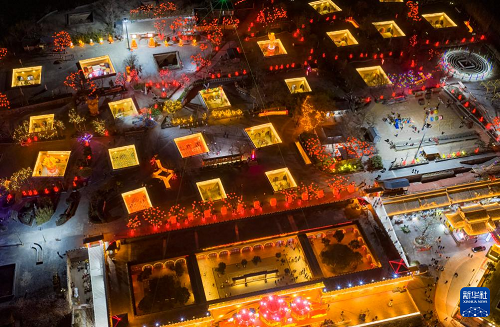 2月10日,人們在河南省三門峽市陜州區(qū)地坑院景區(qū)欣賞花燈(無人機(jī)照片)。(新華社發(fā) 孫猛 攝)