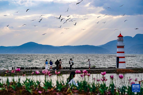 春日暖陽下,昆明滇池碧波蕩漾,遠(yuǎn)山如黛,紅嘴鷗翩躚起舞。游人沿岸漫步、駐足拍攝,共繪出一幅生動(dòng)宜人的春游畫卷。