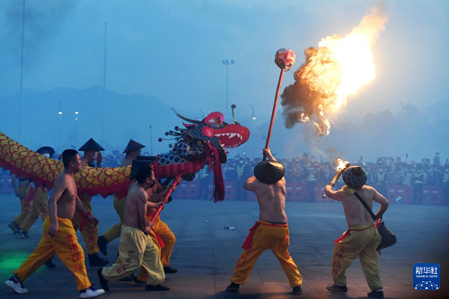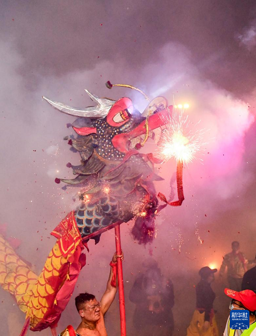 2月27日,在廣西賓陽縣炮龍文化廣場(chǎng),人們?cè)谂邶埞?jié)上舞炮龍。(新華社記者 陸波岸 攝)