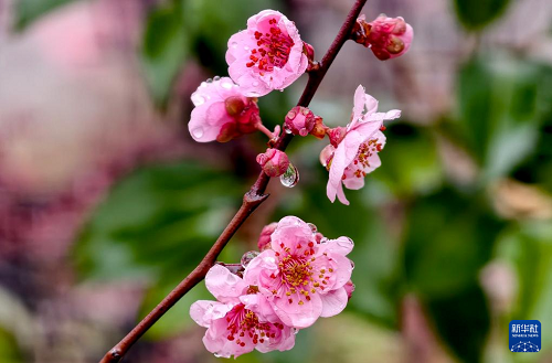 這是3月1日在河南省洛陽市街頭拍攝的雨后梅花。(新華社發(fā) 高山岳 攝)
