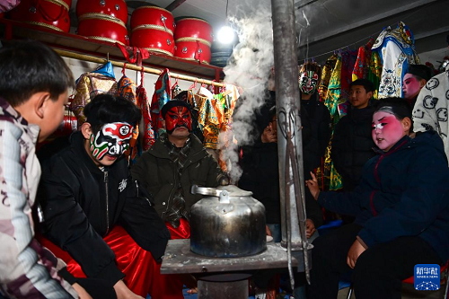 3月2日,隴縣黃花峪村社火隊隊員在相互交流。(新華社記者 鄒競一 攝)