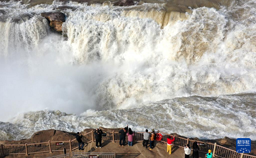 3月5日,游客在黃河壺口瀑布景區(qū)游覽(無(wú)人機(jī)照片)。(新華社發(fā) 呂桂明 攝)