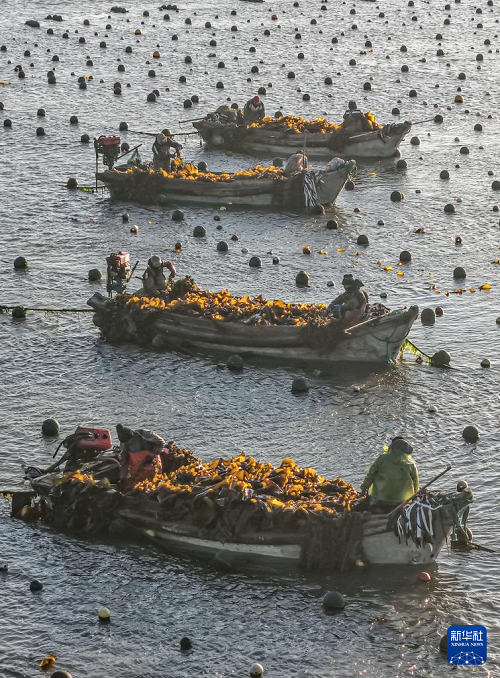 眼下,在我國海帶主產(chǎn)區(qū)山東省榮成市,海洋牧場海帶養(yǎng)殖區(qū)一派繁忙景象。養(yǎng)殖戶對近岸養(yǎng)殖區(qū)達到成熟標(biāo)準(zhǔn)的海帶分批收割,為后期收割的海帶留出生長空間,以便提高海帶產(chǎn)量和質(zhì)量。