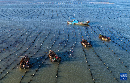 3月9日,在山東省榮成市愛倫灣海洋牧場海帶養(yǎng)殖區(qū),養(yǎng)殖工人收獲海帶(無人機照片)。(新華社發(fā) 李信君 攝)