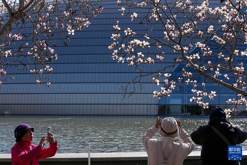 3月9日,游客在國家大劇院旁欣賞盛開的玉蘭花。(新華社記者 鞠煥宗 攝)