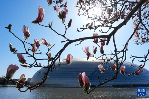 國家大劇院旁玉蘭花盛開(3月9日攝)。(新華社記者 鞠煥宗 攝)