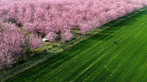3月11日拍攝的西安市鄠邑區(qū)甘河街道丁村的梅花種植園(無人機照片)。(新華社記者 鄒競一 攝)