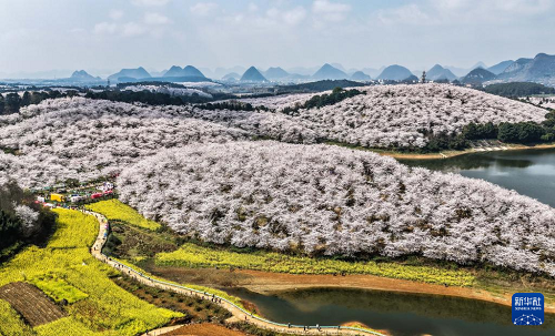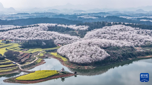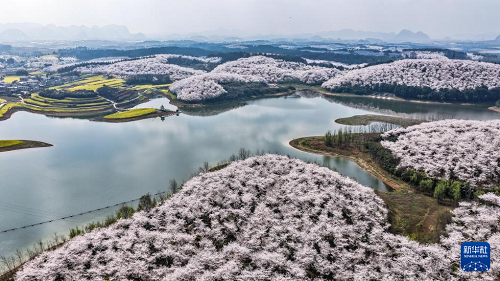 近日,隨著氣溫回升,貴州省貴安新區(qū)櫻花園內(nèi)的2.4萬畝櫻花迎來盛花期。如云似霞的櫻花和山川、湖泊、民居構(gòu)成一幅幅美麗的春日畫卷,吸引眾多游客前來觀光游玩。