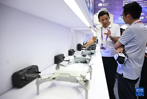 4月15日,采購(gòu)商在廣交會(huì)現(xiàn)場(chǎng)參觀選購(gòu)無(wú)人機(jī)。(新華社記者 盧漢欣 攝)