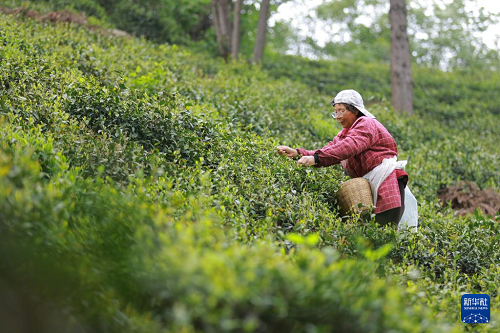 4月20日,在河南省信陽市浉河區(qū)浉河港鎮(zhèn)郝家沖村何家寨茶山,茶農(nóng)在采摘信陽毛尖。(新華社發(fā) 聶品 攝)