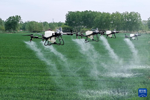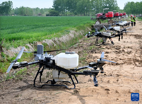 4月28日,在青島市西海岸新區(qū)大場鎮(zhèn)綠色增糧先行區(qū),植保無人機(jī)準(zhǔn)備開展“一噴三防”作業(yè)。(新華社記者 李紫恒 攝)