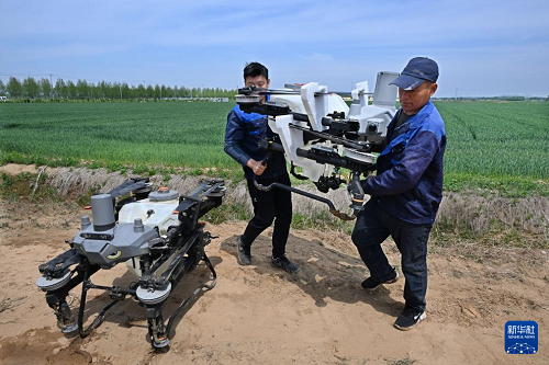 4月28日,在青島市西海岸新區(qū)大場鎮(zhèn)綠色增糧先行區(qū),工作人員在搬運(yùn)植保無人機(jī)。(新華社記者 李紫恒 攝)