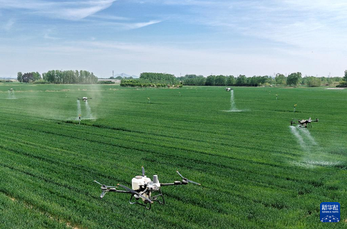 4月28日,在青島市西海岸新區(qū)大場鎮(zhèn)綠色增糧先行區(qū)麥田里,植保無人機(jī)在進(jìn)行“一噴三防”作業(yè)(無人機(jī)照片)。(新華社記者 李紫恒 攝)