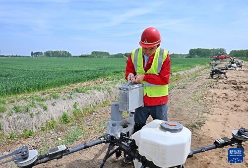 4月28日,在青島市西海岸新區(qū)大場鎮(zhèn)綠色增糧先行區(qū),一名飛手為植保無人機(jī)更換電池。(新華社記者 李紫恒 攝)