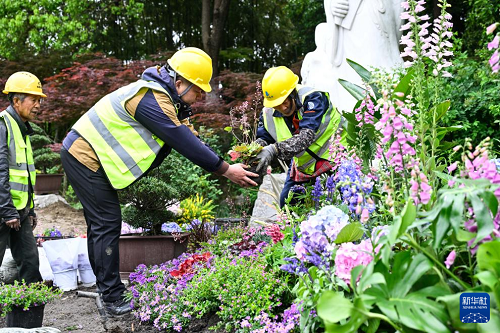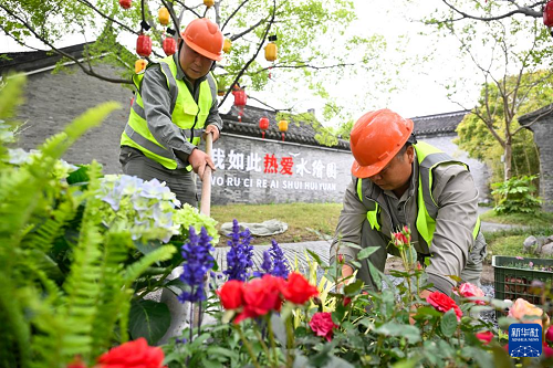 4月28日,參賽隊伍在如皋水繪園風(fēng)景區(qū)營造花境作品。(新華社記者 季春鵬 攝)
