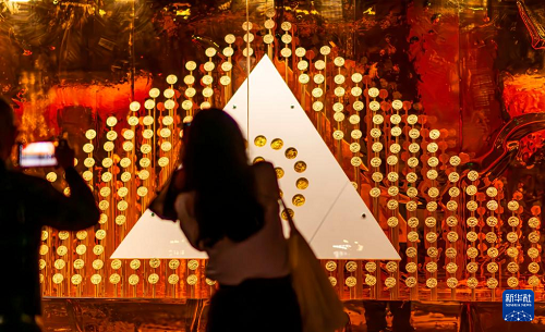 觀眾在拍攝海昏侯墓出土的385枚餅形金(4月29日攝)。(新華社記者 魏培全 攝)