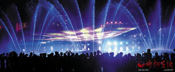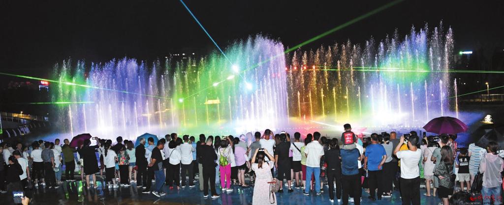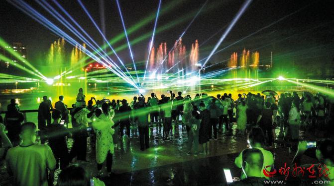 公園在注重園林、景觀建設(shè)的同時(shí),突出主題文化內(nèi)涵的展現(xiàn),湖水噴泉、觀賞果園、主題植物園、階梯花臺等特色園林具有觀賞性,園內(nèi)還配套建有遺山文化館、張拉膜廣場、健舞劇場、休閑茶吧、咖啡館等群眾休閑活動場所,是又一惠及民生的心靈家園。圖為8月1日晚,市民在遺山公園噴泉廣場觀賞絢麗多彩的噴泉燈光秀。劉紀(jì)森 智芝龍 白曉明 胡 煒 攝