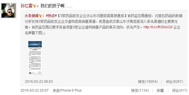 新聞截圖 繼章子怡、賈乃亮等人在微博發(fā)聲關(guān)注疫苗安全問(wèn)題后,3月22日晚,孫紅雷也在微博心痛呼叫“我的孩子……”任賢齊在微博中寫(xiě)道:“請(qǐng)重視并嚴(yán)懲無(wú)良商人!別讓這些混蛋荼毒孩子們的健康!”舒淇、趙薇也排隊(duì)轉(zhuǎn)發(fā)并利用自身名人效應(yīng)呼吁。
