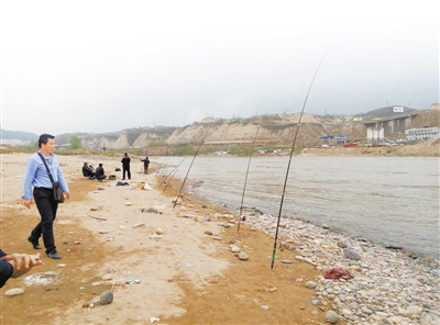 當(dāng)日下午3時(shí)許,蘭州晨報(bào)記者在雁白大橋西側(cè)的黃河岸邊看到12把魚(yú)竿一字排開(kāi),3名釣魚(yú)者坐在旁邊沙灘上正在等待魚(yú)兒上鉤,還有兩名中年男子正在周圍撒網(wǎng)。在相隔十多米處,記者發(fā)現(xiàn)還有兩名男子分別撐著魚(yú)竿釣魚(yú),有一名捕魚(yú)者在撒網(wǎng)?!斑@是雙面粘漁網(wǎng),河內(nèi)稍大一些的魚(yú)兒只要撞進(jìn)網(wǎng)里就擺脫不了?!币幻遏~(yú)男子得意地說(shuō)。
