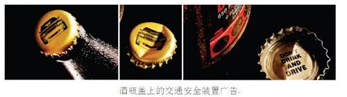美國(guó)將警示語作為酒品包裝的強(qiáng)制性標(biāo)注內(nèi)容,要求飲料,酒的品牌標(biāo)簽、獨(dú)立的前標(biāo)簽或者背標(biāo)簽、側(cè)標(biāo)簽都應(yīng)獨(dú)立,并有別于標(biāo)簽中其他信息地標(biāo)示:“政府警示,根據(jù)普通外科醫(yī)生建議,孕婦不應(yīng)該飲酒,以防止新生兒缺陷,飲酒會(huì)減弱個(gè)人駕駛車或操控機(jī)械的能力并可能引發(fā)健康問題?!贝送?國(guó)外的產(chǎn)品包裝設(shè)計(jì)上也植入了公益理念。如上圖廣告可對(duì)飲酒人群針對(duì)性的進(jìn)行廣告宣傳,采用打開酒瓶蓋必須以破壞“車輛”為代價(jià)的形式,傳達(dá)喝酒不能開車的安全理念。