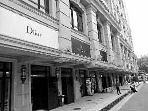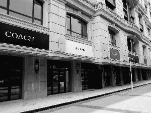 昨日,北京晨報(bào)記者來(lái)到位于建國(guó)門(mén)橋附近的中海楓丹公館,看到整個(gè)樓盤(pán)有五棟樓,呈凹字形。建筑物四周設(shè)有30多個(gè)大小不一的底商,每個(gè)底商頂部都掛著一個(gè)看似國(guó)際大牌的招牌,既有奢侈品,也有快餐業(yè),顏色鮮艷,十分奪目。就在這些大牌的招牌旁邊,張貼著大幅廣告“黃金旺鋪火爆招商中”。