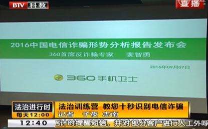 中國(guó)經(jīng)濟(jì)網(wǎng)北京9月12訊 生活中,當(dāng)你接到詐騙電話的時(shí)候,你要多久能發(fā)現(xiàn)這個(gè)騙局呢,10秒?20秒?還是根本識(shí)別不出來(lái)?9月10日,北京衛(wèi)視《法治進(jìn)行時(shí)》欄目在節(jié)目一開(kāi)始便拋出了這樣一個(gè)問(wèn)題。面對(duì)電信詐騙分子日益多變的手法,如何頭腦清晰地最快識(shí)別出騙局?這一期的《法治進(jìn)行時(shí)》和360手機(jī)衛(wèi)士專家一起給大家提供了很多實(shí)用的建議。