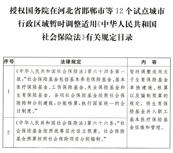新華社北京12月25日電 全國(guó)人民代表大會(huì)常務(wù)委員會(huì)關(guān)于授權(quán)國(guó)務(wù)院在河北省邯鄲市等12個(gè)試點(diǎn)城市行政區(qū)域暫時(shí)調(diào)整適用《中華人民共和國(guó)社會(huì)保險(xiǎn)法》有關(guān)規(guī)定的決定 (2016年12月25日第十二屆全國(guó)人民代表大會(huì)常務(wù)委員會(huì)第二十五次會(huì)議通過(guò)) 為進(jìn)一步增強(qiáng)生育保險(xiǎn)保障功能,提高社會(huì)保險(xiǎn)基金共濟(jì)能力,推進(jìn)生育保險(xiǎn)和基本醫(yī)療保險(xiǎn)合并實(shí)施改革,第十二屆全國(guó)人民代表大會(huì)常務(wù)委員會(huì)第二十五次會(huì)議決定:授權(quán)國(guó)務(wù)院在河北省邯鄲市、山西省晉中市、遼寧省沈陽(yáng)市、江蘇省泰州市、安徽省合肥市、山東省威海市、河南省鄭州市、湖南省岳陽(yáng)市、廣東省珠海市、重慶市、四川省內(nèi)江市、云南省昆明市行政區(qū)域暫時(shí)調(diào)整適用《中華人民共和國(guó)社會(huì)保險(xiǎn)法》第六十四條、第六十六條關(guān)于生育保險(xiǎn)基金單獨(dú)建賬、核算以及編制預(yù)算的規(guī)定(目錄附后),將生育保險(xiǎn)基金并入職工基本醫(yī)療保險(xiǎn)基金征繳和管理。試點(diǎn)方案由國(guó)務(wù)院作出安排,并報(bào)全國(guó)人民代表大會(huì)常務(wù)委員會(huì)備案。本決定實(shí)施期限為二年。 國(guó)務(wù)院及其人力資源社會(huì)保障、財(cái)政、衛(wèi)生計(jì)生等部門要遵循保留險(xiǎn)種、保障待遇、統(tǒng)一管理、降低成本的總體思路,加強(qiáng)對(duì)試點(diǎn)工作的組織指導(dǎo)和監(jiān)督檢查,及時(shí)總結(jié)經(jīng)驗(yàn),并就暫時(shí)調(diào)整適用有關(guān)法律規(guī)定的情況向全國(guó)人民代表大會(huì)常務(wù)委員會(huì)作出報(bào)告。對(duì)實(shí)踐證明可行的,修改完善有關(guān)法律規(guī)定;對(duì)實(shí)踐證明不宜調(diào)整的,恢復(fù)施行有關(guān)法律規(guī)定。 本決定自2017年1月1日起施行。