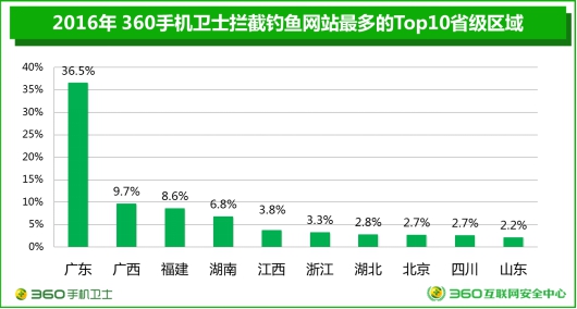 360大數(shù)據(jù)對(duì)釣魚網(wǎng)站地域分布也進(jìn)行了精準(zhǔn)分析,整體來(lái)看,手機(jī)端釣魚網(wǎng)站攔截量占比最高的地區(qū)為廣東省,以壓倒性的36.5%位居榜首;其次為廣西(9.7%)、福建(8.6%)、湖南(6.8%)和江西(3.8%)。