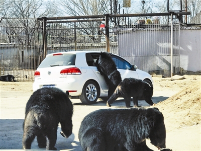 北青報記者從網(wǎng)友上傳的照片中看到,一輛白色自駕車在黑熊區(qū)域???,車窗打開,有兩只黑熊靠近自駕車,趴在車窗外。