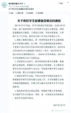 學(xué)校官方微博就此事所做通報(bào)的截圖 隨著民間金融在網(wǎng)絡(luò)平臺(tái)迎風(fēng)生長(zhǎng),校園也成了重點(diǎn)區(qū)域之一。近日,南京航空航天大學(xué)的不少同學(xué)反映,他們被一名曾擔(dān)任過(guò)學(xué)校輔導(dǎo)員的男子騙取個(gè)人信息辦理借貸,錢全部被該男子拿走,由于遭到網(wǎng)貸平臺(tái)催債,學(xué)生心驚膽戰(zhàn),紛紛報(bào)警求助?,F(xiàn)代快報(bào)記者從該校了解到,學(xué)生反映的情況基本屬實(shí),但涉嫌詐騙的男子已失聯(lián),目前已基本確定的涉案金額超過(guò)40萬(wàn)元。 學(xué)生投訴 被以各種理由騙取個(gè)人信息辦理網(wǎng)貸 據(jù)張同學(xué)(化姓)反映,王某曾是南航機(jī)電學(xué)院的一名輔導(dǎo)員,先后找不少學(xué)生幫忙“辦事”。 “一個(gè)說(shuō)法是幫朋友拓展業(yè)務(wù)?!睋?jù)這位同學(xué)稱,在2015年10月初到2016年1月中下旬,王某通過(guò)各種方式找到一些學(xué)生,稱要幫在銀行工作的朋友拓展業(yè)務(wù),讓大家?guī)兔k一張普通的銀行儲(chǔ)蓄卡。 對(duì)于這個(gè)理由,包括張同學(xué)在內(nèi)的人都沒(méi)有起疑,他們提供了身份證。隨后,王某又提出要開(kāi)通網(wǎng)上銀行,需要進(jìn)行臉部識(shí)別?!按蠹蚁±锖康鼐透チ怂乃奚幔陔娔X上對(duì)著攝像頭做出點(diǎn)頭、眨眼、微笑等動(dòng)作,之后就讓我們離開(kāi)了?!睆埻瑢W(xué)說(shuō),在做完這些之后,王某又做了什么事,他們不清楚。 另外,王某當(dāng)初提出要把銀行短信提醒的手機(jī)號(hào)設(shè)成他的,而不是這些學(xué)生的,“說(shuō)是為了不讓我們受短信騷擾?!贝送猓瑸榱嗽趲屯昝蟆翱焖黉N卡”,王某又獲取了卡的密碼。 張同學(xué)說(shuō),通過(guò)這種方式,王某竊取了30多名南航學(xué)生的身份信息,在某“理財(cái)平臺(tái)”冒名借貸。 據(jù)記者初步了解,不少學(xué)生被王某“誆騙”所借貸的平臺(tái)不止一個(gè)。有些人還在另一個(gè)平臺(tái)上借了錢,這些錢同樣都落到了王某的口袋。 校方通報(bào) 學(xué)生被騙的錢,基本確定的已有40萬(wàn) 據(jù)現(xiàn)代快報(bào)記者跟南京航空航天大學(xué)方面核實(shí),目前有40多萬(wàn)的金額是基本可以確定的。 在4月7日下午,“@南京航空航天大學(xué)”官微發(fā)布了“關(guān)于我校學(xué)生疑遭騙貸情況的通報(bào)”,通報(bào)稱,從2017年2月中旬起,有學(xué)生陸續(xù)向?qū)W校反映,自2014年10月底,被王某冒用名義在網(wǎng)貸平臺(tái)進(jìn)行小額貸款,因貸款逾期被多次催款,王某已失聯(lián)。學(xué)校高度重視,立即成立專門工作組,組織有關(guān)部門及學(xué)院開(kāi)展相關(guān)工作。經(jīng)調(diào)查了解,學(xué)生反映的情況基本屬實(shí)。 通報(bào)稱,王某于2011年9月至2013年6月?lián)卧撔]o導(dǎo)員;2013年9月至2016年4月為該校碩士研究生,其中2013年9月至2014年6月任兼職輔導(dǎo)員,2016年4月畢業(yè)離校。2017年2月學(xué)校調(diào)查時(shí)已處于失聯(lián)狀態(tài)。 記者跟張同學(xué)等人核實(shí),他們稱被騙本金總的是90萬(wàn),待還的70萬(wàn)左右。與校方目前確定的數(shù)目存在較大出入,原因是除統(tǒng)計(jì)正在進(jìn)行之外,據(jù)稱有些屬于認(rèn)定方面的問(wèn)題。 記者調(diào)查 涉事學(xué)生群:已知的“背鍋人”有45名 從2016年7月開(kāi)始,涉事學(xué)生父母陸續(xù)收到網(wǎng)貸平臺(tái)的催款電話。到2016年10月中下旬,又有學(xué)生再次收到催款電話。涉事學(xué)生當(dāng)即與王某通過(guò)電話、微信溝通。 “當(dāng)時(shí)他親口跟我承認(rèn),曾在兩個(gè)網(wǎng)貸平臺(tái)上冒用學(xué)生信息借錢?!睆埻瑢W(xué)說(shuō):“但他騙取我們信息的時(shí)候已經(jīng)不是輔導(dǎo)員了。就是利用輔導(dǎo)員身份,讓我們相信他。”王某當(dāng)時(shí)表示,保證會(huì)還完所欠貸款。 2016年11月,王某電話告訴部分被騙學(xué)生,稱經(jīng)過(guò)瑞金路派出所的調(diào)解,已經(jīng)先還一部分到期的錢,剩余的錢過(guò)段時(shí)間再還。王某承認(rèn)此事由他一人所為,和學(xué)生無(wú)關(guān)。這之后,學(xué)生就聯(lián)系不上王某了。 今年2月以來(lái),部分學(xué)生再次收到催款信息,收到疑似催款律師函、第三方催款恐嚇電話信息等。學(xué)生創(chuàng)建了涉事學(xué)生群,統(tǒng)計(jì)到涉事學(xué)生45名,之后涉事學(xué)生代表在校方人員陪同下,到瑞金路派出所報(bào)案。 被騙學(xué)生:幫王某對(duì)著攝像頭“對(duì)口型” 小李(化姓)也是南航的學(xué)生。他說(shuō)王某也以自己的名義在網(wǎng)貸平臺(tái)借過(guò)款,“我曾在王某的創(chuàng)業(yè)項(xiàng)目里兼職,當(dāng)時(shí)王某是輔導(dǎo)員。2015年下半年,王某多次以南京某網(wǎng)絡(luò)科技有限公司的名義與我聯(lián)系,聲稱正在開(kāi)展一項(xiàng)校園創(chuàng)業(yè)項(xiàng)目。該項(xiàng)目能夠申請(qǐng)南京市優(yōu)秀創(chuàng)業(yè)項(xiàng)目補(bǔ)貼,但需要有學(xué)籍的學(xué)生,希望我?guī)兔?。?/p> “他之前是學(xué)校的輔導(dǎo)員,我沒(méi)多想就答應(yīng)了他?!敝?,小李受邀到了王某辦公室,王某打開(kāi)申請(qǐng)網(wǎng)站讓小李填入姓名、學(xué)號(hào)、專業(yè)、宿舍地址、父母
