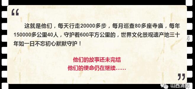 內(nèi)容簡介:該片以守護為主題,以傳承為主線,以現(xiàn)任山西忻州五臺山消防大隊工程師劉川為第一人稱視角,利用紀實跟拍的手法,通過對以劉川為代表的五臺山消防大隊官兵在消防監(jiān)督檢查、消防執(zhí)勤保衛(wèi)、日常工作生活等方面點點滴滴的真實紀錄,向觀眾展示了五臺山消防官兵在長期默默守護五臺山600平方公里的世界文化景觀遺產(chǎn)地和數(shù)十座文物古建筑消防安全中的辛勤付出和無私奉獻,也讓觀眾了解了30多年來深深根植于每一代五臺山消防人心中的那份不忘初心、不畏艱辛、舍己奉公、代代傳承的五臺山消防精神。