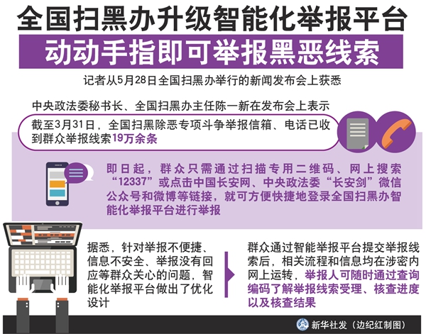 新華社北京5月28日電(記者白陽)還在擔(dān)心舉報(bào)黑惡線索不便捷、不安全、沒回應(yīng)?即日起,群眾只需通過掃描專用二維碼、網(wǎng)上搜索“12337”或點(diǎn)擊中國長安網(wǎng)、中央政法委“長安劍”微信公眾號和微博等鏈接,就可方便快捷地登錄全國掃黑辦智能化舉報(bào)平臺進(jìn)行舉報(bào)。