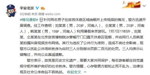 通報稱,經(jīng)工作查明:劉某某(男,20歲,河南人)、仝某某(男,20歲,河南人),韓某某(男,19歲,河南人)利用暑假來京游玩。7月7日11時許,劉某某、仝某某在北京故宮博物院冰窖餐廳門口露天休息區(qū)吸煙,并由同行人員韓某某拍攝抖音視頻發(fā)布網(wǎng)絡(luò)。其行為違反了公共行為準則,造成不良社會影響,現(xiàn)警方以擾亂公共場所秩序為由對三人分別做出罰款二百元的處罰。三人均表示認錯悔過,并向公眾真誠道歉。