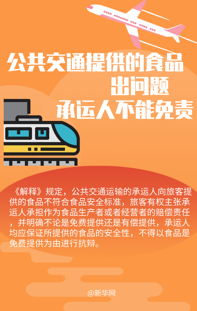 《解釋》規(guī)定,公共交通運(yùn)輸?shù)某羞\(yùn)人向旅客提供的食品不符合食品安全標(biāo)準(zhǔn),旅客有權(quán)主張承運(yùn)人承擔(dān)作為食品生產(chǎn)者或者經(jīng)營(yíng)者的賠償責(zé)任,并明確不論是免費(fèi)提供還是有償提供,承運(yùn)人均應(yīng)保證所提供的食品的安全性,不得以食品是免費(fèi)提供為由進(jìn)行抗辯。