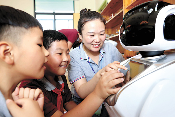 為緩解未成年人假期“看護(hù)難”問(wèn)題,安徽省合肥市瑤海區(qū)試點(diǎn)免費(fèi)提供音體美興趣培養(yǎng)、公益看護(hù)、讀書(shū)賞析、作業(yè)輔導(dǎo)、科技創(chuàng)新等為主要內(nèi)容的“五彩假日”托管和教育服務(wù)。圖為孩子們?cè)诤蜋C(jī)器人做互動(dòng)游戲。 新華社發(fā)(解琛 攝)