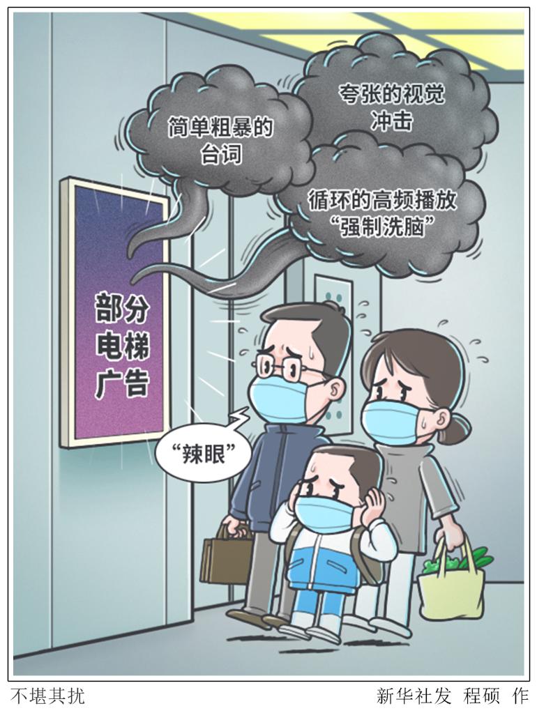 身著“清涼”的女模特大喊“沒有XXX,我不脫!”;女子掀開“暴汗服”露出腹部,“潑”出大量汗水;身材壯碩的男模特躺在餐桌上,名為“小鮮肉上桌”……記者近日發(fā)現(xiàn),在眾多住宅樓電梯間,雷人雷語的“辣眼”廣告層出不窮。這些廣告以簡單粗暴的臺詞、夸張的視覺沖擊、循環(huán)的高頻播放“強制洗腦”,引起大量居民不適與反感。