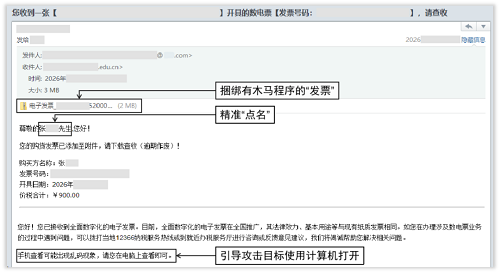 “【電子發(fā)票】張某某先生,您的發(fā)票已開好,請點擊下載”——當(dāng)收件箱彈出這類帶著你真實姓名的電子郵件,你是否會下意識點擊?注意!這可能是境外間諜情報機(jī)關(guān)實施的精準(zhǔn)網(wǎng)絡(luò)攻擊。一旦點擊郵件中的附件或者鏈接,設(shè)備將瞬間淪為間諜竊密的“突破口”,安全風(fēng)險隨之而來。