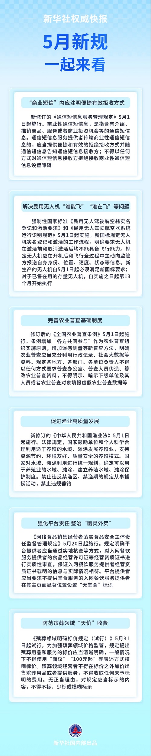 規(guī)定“商業(yè)短信”內(nèi)應(yīng)注明便捷有效拒收方式;解決民用無(wú)人機(jī)“誰(shuí)能飛”和“誰(shuí)在飛”等問(wèn)題;完善農(nóng)業(yè)普查基礎(chǔ)制度……5月新規(guī),一起來(lái)看。