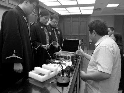 法官當(dāng)庭檢查齊某提供的理療儀,發(fā)現(xiàn)是三無產(chǎn)品。京華時(shí)報(bào)記者鄭羽佳攝