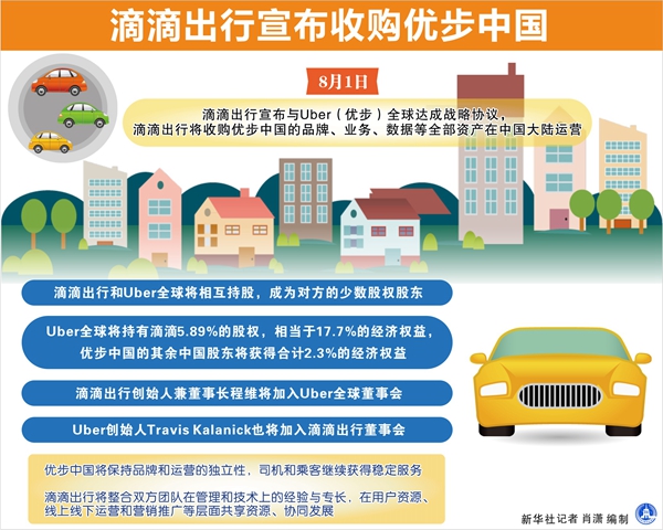 1日,滴滴出行宣布與Uber全球達成戰(zhàn)略協(xié)議,滴滴出行將收購優(yōu)步中國的品牌、業(yè)務(wù)、數(shù)據(jù)等全部資產(chǎn),在中國大陸運營。