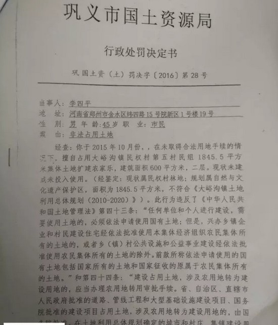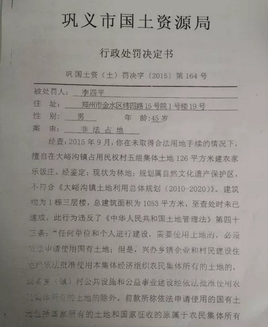 據(jù)記者獲取的材料顯示,2015年12月份,鞏義市國土資源局對(duì)李四平進(jìn)行處罰,案由為“非法占地”。李四平擅自占用集體土地126平方米,建設(shè)農(nóng)家樂,土地性質(zhì)為林地。對(duì)其處罰為“自行拆除在非法占用的126平方米土地上新建的建筑物和其他設(shè)施,恢復(fù)土地原狀”“對(duì)非法占用的126平方米土地,按每平方米3元處以罰款,共378元。”