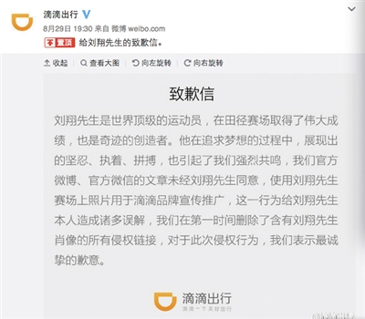 8月29日晚間,滴滴發(fā)出道歉信稱,“官方微博、官方微信的文章未經(jīng)劉翔同意,使用劉翔賽場(chǎng)上照片用于滴滴品牌宣傳推廣,這一行為給劉翔本人造成諸多誤解,在第一時(shí)間刪除了含有劉翔先生肖像的所有侵權(quán)鏈接,對(duì)于此次侵權(quán)行為,我們表示最誠(chéng)摯的歉意。”