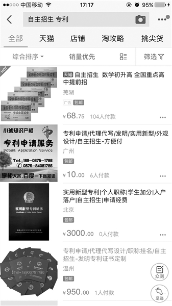 市場需求使得部分專利代理公司打起了高中學生群體的主意。北青報記者在淘寶網上以“自主招生專利”為關鍵詞進行搜索,發(fā)現(xiàn)有多家知識產權服務機構的網店寫明可以提供“專利申請”、“專利轉讓”等服務,并注明專利是“自主招生考試通行證”。