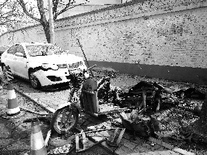 昨日,北京晨報(bào)記者來(lái)到酒仙橋二街坊附近,在1號(hào)樓樓下聚著一群人,正在討論凌晨爆炸的事情,“簡(jiǎn)直就是個(gè)移動(dòng)隱患”,“還好不是白天,不然肯定有人受傷”。記者看到,一輛綠色三輪車嚴(yán)重?fù)p毀,車輪扭曲倒在地上,車身部分被炸成了一張橫鋪著的大鐵皮,經(jīng)過(guò)灼燒后變得焦黑。三輪車的部分零件丟失,旁邊的樹(shù)上掛著鐵條,十幾米外的墻邊散落著三輪車的架子,而車輛原本放置電瓶的地方空無(wú)一物。在三輪車旁,一個(gè)大煤氣罐被炸成三部分,中間圓筒狀變成一塊鋪展后約1平方米的厚鐵皮,上下兩端則變成兩個(gè)圓形的蓋子(如圖)。