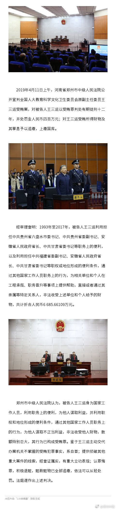 人民網(wǎng)北京4月11日電 據(jù)鄭州市中級(jí)人民法院官方微博消息,2019年4月11日上午,河南省鄭州市中級(jí)人民法院公開宣判全國(guó)人大教育科學(xué)文化衛(wèi)生委員會(huì)原副主任委員王三運(yùn)受賄案,對(duì)被告人王三運(yùn)以受賄罪判處有期徒刑十二年,并處罰金人民幣四百萬(wàn)元;對(duì)王三運(yùn)受賄所得財(cái)物及其孳息予以追繳,上繳國(guó)庫(kù)。