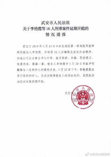 通報(bào)還稱,原定于2019年5月23日9時(shí)在武安市人民法院第一審判庭開庭審理的被告人李艷霞、許琪等16人涉嫌聚眾擾亂社會(huì)秩序偽造公司企業(yè)事業(yè)單位印章、敲詐勒索、詐騙、職務(wù)侵占、故意傷害、窩藏一案,被告人李艷霞于5月20日書面聲明解除與二名辯護(hù)人的委托關(guān)系。5月 22日下午,李艷霞提出另行委托辯護(hù)人。為充分保障被告人的訴訟權(quán)利,武安市人民法院依法決定對(duì)本案延期開庭。